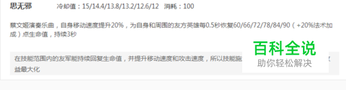 一技能:思无邪 冷却值:15/14.4/13.8/13.2/12.6/12消耗:100 蔡文姬演奏乐曲,自身移动速度提升20%,为自身和周围的友方英雄每0.5秒恢复60/66/72/78/84/90(+20%法术加成)点生命值,持续3秒 在技能范围内的友军能持续回复生命值,并提升移动速度和攻击速度,所以技能施放时尽量靠近多个友军,使得收益最大化 缺点:冷却时间长,所以尽量的多覆盖到队友吧