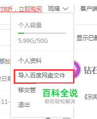 通过浏览器登录百度企业网盘进行操作,点击姓名旁的下拉菜单——导入百度网盘文件;