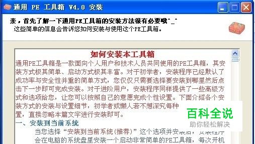 通用PE工具箱的制作方法有四种,你比较喜欢哪一种呢?小编今天就用图解法把四种方法都教给大家,总有一款适合你,心动不如行动,马上开始学习吧! 第一种:安装到本系统 此方法是将通用PE工具箱安装到本系统中,再重启电脑,电脑选择界面就会出现”通用PE工具箱“选项,通过此选项即可进入。 首先做好准备 去官网下载最新的通用PE工具箱。实行操作步骤1.运行开始下载的通用PE工具箱,点击下一步,如图: 2.再点击“知道了”,如图: 3.推荐选择“安装到当前系统”,点击“选好了”,如图: 4.可以自己设置相关参数,也可以不用设置,单击“安装”,如图: 5.等待安装的完成,如图: 6.安装后,单击“完成”,如图: 7.关闭所有应用程序,重新启动电脑,在开机选择画面时,会出现通用PE工具箱的选项,选中它即可进入PE界面,如图: 第二种:制作启动U盘 此方式是将通用PE工具箱安装到U盘,把U盘制作成启动U盘,再把这个U盘启动电脑进入系统。 首先做好准备1:去官网下载最新的通用PE工具箱。2.U盘一个。实行操作步骤1.运行刚才下载的通用PE工具箱,单击下一步,如图: 2.直接单击“知道了”,如图: 3.选择“制作可启动U盘“,单击“选好了”,如图: 4.在这里选择要制作的U盘和制作方式,然后单击“制作”按钮,如图: 在弹出的对话框中,单击“确定”按钮,如图; 5.等待安装的完成,如图: 6.安装后,单击“完成”,如图: 7.关闭所有应用程序,重新启动电脑,按下F12快捷键,进入选择界面,按下【01】选项,选中它即可进入PE界面,如图: 第三种:安装到移动硬盘或本地磁盘 此方法是将通用PE工具箱安装到移动硬盘或者本地磁盘上,然后利用移动硬盘启动电脑进入。 首先做好准备 1:去官网下载最新的通用PE工具箱。2.一个移动硬盘。实行操作步骤1.运行开始下载的通用PE工具箱,单击下一步,如图: 2.单击“知道了”,如图: 3.选择“安装到移动硬盘或本地磁盘”,单击“选好了”,如图: 4.接下来可以自己设置相关参数,也可以默认,单击“安装”按钮,如图: 5.等待安装的完成,如图: 6.安装后,单击“完成”,如图: 7.关闭所有应用程序,重新启动电脑,在开机选择画面时,会出现通用PE工具箱的选项,选中它即可进入界面,如图: 第四种:生成可启动ISO镜像文件 1.运行开始下载的通用PE工具箱,单击下一步,如图: 2.直接单击“知道了”,如图: 3.选择“生成可启动ISO镜像”,单击“选好了”,如图: 4.接下来设置生成的ISO文件的文件名以及存放路径,然后单击“安装”,如图: 5.等待安装的完成,如图: 6.安装后,单击“完成”,如图: 7.现在可以把ISO文件刻录到光盘中,利用此光盘启动电脑,进入PE界面。