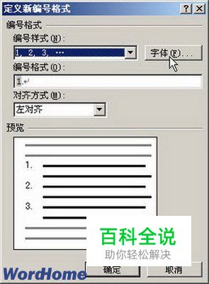 第2步,在打开的“定义新编号格式”对话框中单击“编号样式”下拉三角按钮,在“编号样式”下拉列表中选择一种编号样式,并单击“字体”按钮。