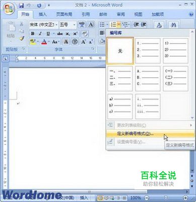 第5步,返回Word2007文档窗口,在“开始”功能区的“段落”分组中单击“编号”下拉三角按钮,在打开的编号下拉列表中可以看到定义的新编号格式。