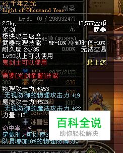 千年:光属性攻击,自带光属性强化20左右,姑且算直接增加10%的伤害,破极兵刃两级进图能增加的攻击也不少,缺点剑身较短,较小,攻击衔接性不强,爆发率很低,刷图亲自测试感觉不给力,唯一的亮点就是光属性,刷暗黑城和异界地图较好,PK中内战优势大鬼剑光抗最低。