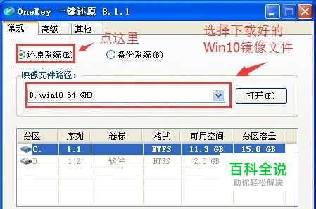 运行软件后,在还原工具里点击还原系统,在镜像文件路径下拉中,选择刚才下载好的Win10_64.GHO镜像文件,如下图