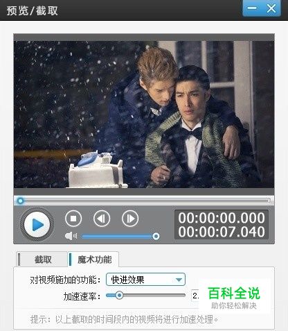 让视频快放 在导入视频时,或在“已添加片段”列表双击要对其加快速度的视频时,会弹出“预览/截取”对话框。我们只需点击“魔术功能”选项卡,在“对视频施加的功能”一栏选择“快进效果”。在“加速速率”滑杆处设置一个值即可。数值越大,表示调节后视频速度越快。