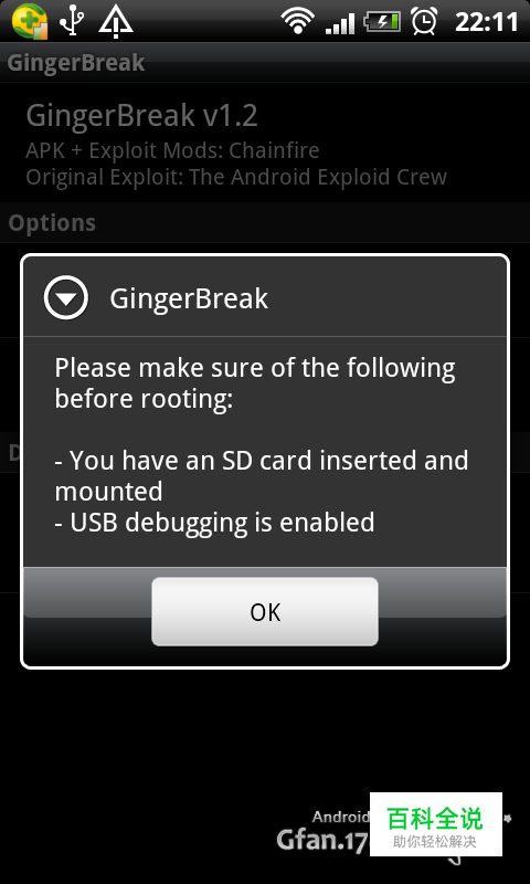 此后不要连接电脑,直接运行GingerBreak1.2,提示必须装有内存卡,且打开USB调试模式,点O K