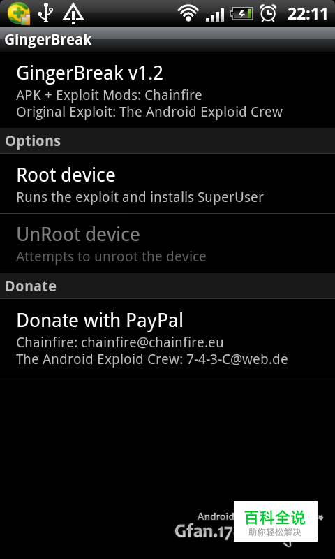 下载一键ROOT软件GingerBreak1.2.apk安装到手机内(用豌豆夹手机助手安装或者直接复制到存储卡直接安装均可)