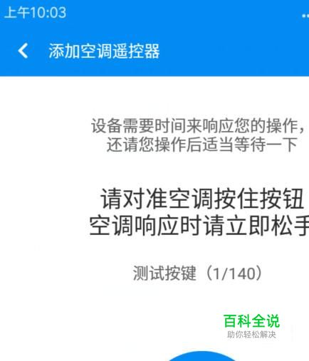 手指轻点一下品牌名字;这就转到了操控界面。界面中间位置显示着一个按钮。手指点住这个按钮,手机则对着空调,等空调起了反应,再松开手。那么,空调就进入到工作状态了。
