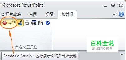 先安装屏幕录制插件成功之后再运行ppt,可以发现在powerpoint菜单栏的“加载项”中有一个“录制”按钮,就是屏幕录像软件的插件了