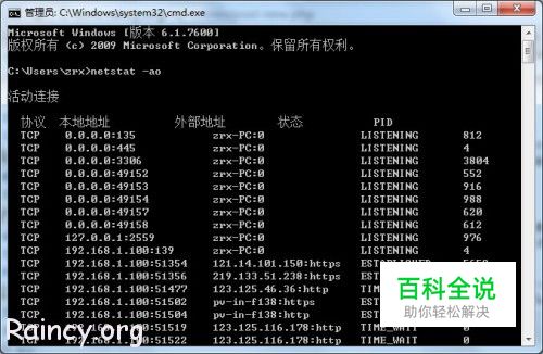 3、然后在我们面前的会是列出一个长长的表单,其中第一列是本地地址例如127.0.0.1:987,前边这一串是IP地址,冒号后面那个是正在被占用的端口。我们需要找出80端口的那一行,然后记下他的PID。比如我的这个图中端口445的这一行,他的pid是4。