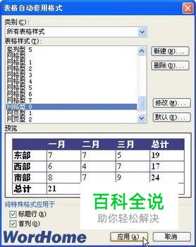 第2步,打开“表格自动套用格式”对话框,在“类别”下拉列表中选择“所有表格样式”选项,这时会在“表格样式”列表中看到系统提供的多种Word表格专业格式。从“表格样式”列表中单击选中所需要的格式(如“网格型8”),在“预览”区域中将显示该格式的预览效果,如图