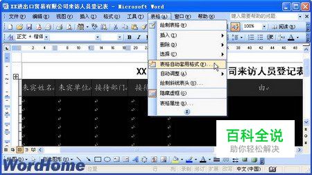 第1步,在Word2003窗口中选中整个表格,在菜单栏中依次单击“表格”→“表格自动套用格式”菜单命令,如图