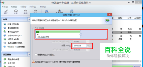 来到此对话框,此时我们可以调整分区大小。然后当鼠标指针变成双向箭头时,拖动直到你满意的容量位置。这里C盘已经被操作为150GB。之后点击“确定”。