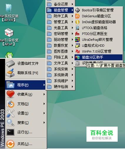 对硬盘分区,我们一般是到PE系统操作。在PE桌面左下角点击“开始”—“程序”—“磁盘管理”—“磁盘分区助手”。