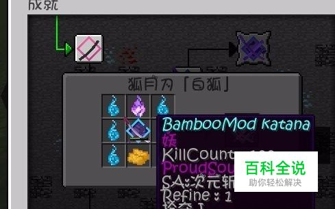 B:狐月刀用竹MOD的日本刀以上面名刀的方式合成: 需要完成199斩以上、拥有1000以上荣耀之魂,且Refine>=1,并有指定的附魔才可以合成狐月刀 白狐刀需要给名刀附魔抢夺,黑狐刀需要附魔亡灵杀手如果安装了豆腐MOD,则将小麦换成稻荷