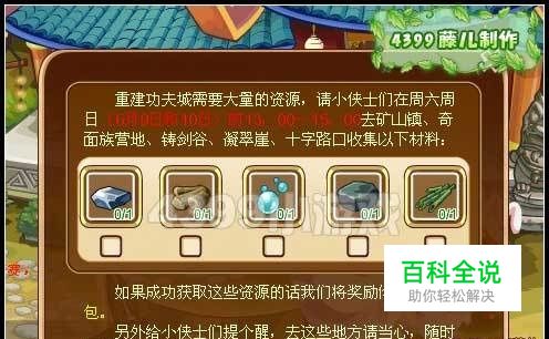 点击重建功夫城,需要小侠士在周六周日(6月9日和10日)的13:00~15:00去矿山镇、奇面族营地、铸剑谷、凝翠崖、十字路口收集铁块、木头、水、巨石、竹子,收集完成后就能获得建设礼包哦!