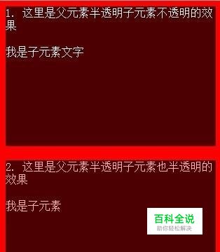html代码: <body> <div class="rgba"> 1. 这里是父元素半透明子元素不透明的效果 <p>我是子元素文字</a> </div> <div class="opacity"> 2. 这里是父元素半透明子元素也半透明的效果 <p>我是子元素</a> </div> </body>