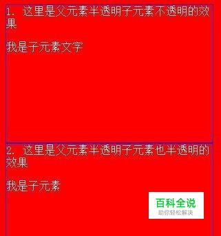 得出最终结果:可以看出第一个div实现了父元素半透明子元素不透明,第二个子元素是父元素和子元素均透明。