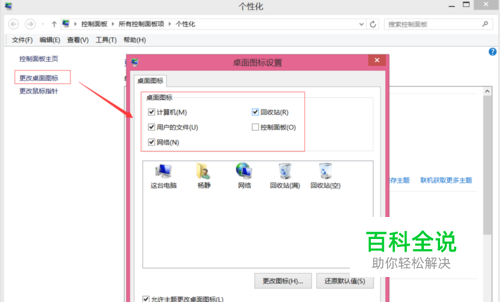方法一:在桌面空白处点击右键,选择“个性化”然后选择“更改桌面图标”