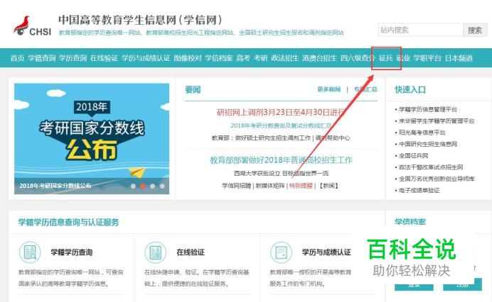 首先,打开学信网首页,点击页面中的“征兵”菜单按钮。