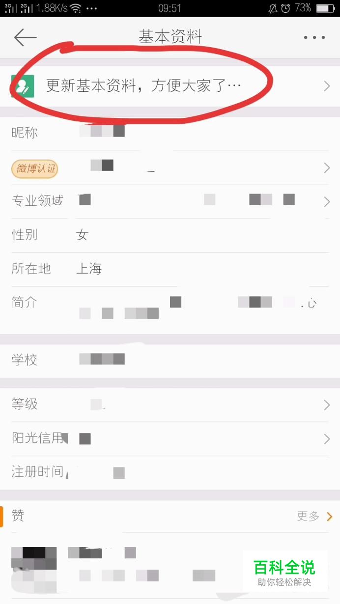 在账号的基本资料中,找到“更新基本资料,方便大家了……”这个这段文字,点击进入,如下图所示红色标注内容。