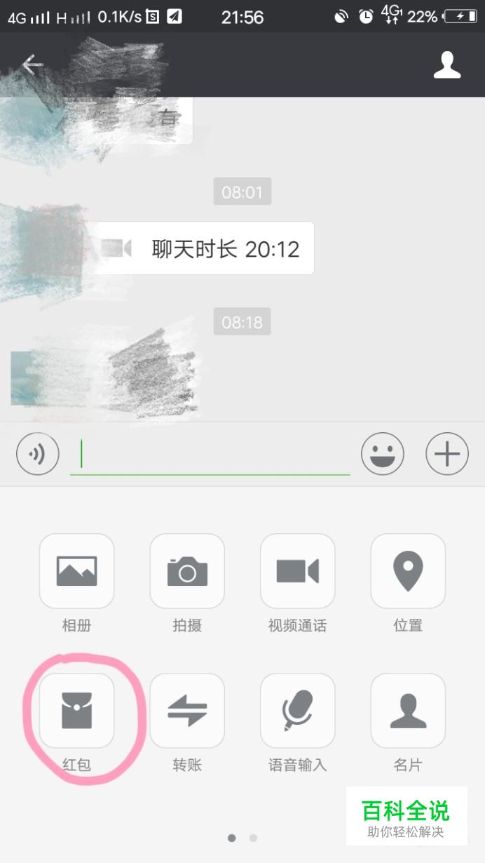 点开聊天页面,如果打算给某个人发红包,点击表情按钮右边的按钮,选择红包指令。