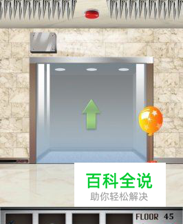 100层电梯游戏第四十五关中,电梯门前有一个礼物盒上面系着一个气球,在电梯门的左上方有一个正在喷气的盒子,在电梯门的顶端全部是尖刺,只有正中位置有一个红色按钮。