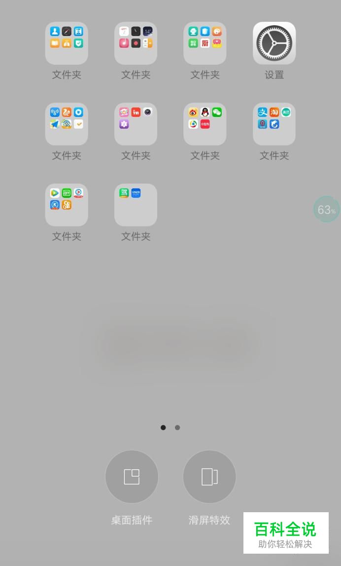 首先我们将两个手指分别指着屏幕的左上角和右下角,然后向里面合拢,就会出现桌面插件和滑屏特效两个字眼。