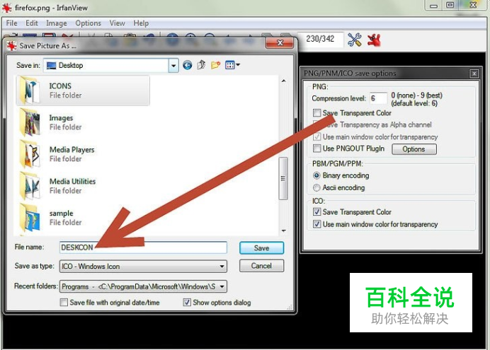 保存文件。 保存文件>另存为。 选择二进制编码。 选择保存透明色彩。 选择桌面>以图标文件夹为保存位置。 比如,命名文件为 Deskcon。