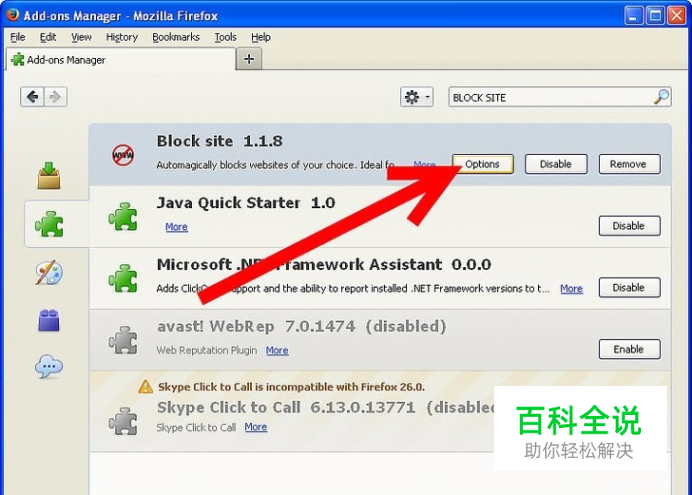 从“插件管理器”选项卡,单击“扩展”,然后选择下载的阻断和开放网站的插件名称。