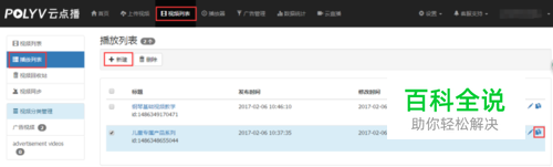 在登陆保利威视的后台并进入云点播的界面后,选择顶部功能列表的【视频列表】,点击右侧的【播放列表】,在播放列表新建添加视频。再回到播放列表页面,最右侧有一个表示代码的小图标,如下图: