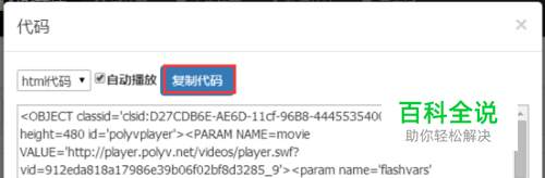 点击小图标进入【代码】界面,单击【复制代码】,就得到了带有播放列表的视频代码,从其中拿到listid的值,在多终端播放代码中加上listid参数。