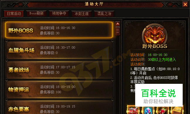 9377奇迹来了是一款独有引擎打造的3D页游,高度还原游戏宏伟的故事剧情、炫丽的流光装备、深入人心的技能和“血色城堡”、“恶魔广场”等特色玩法。奇迹来了每日活动丰富多彩,让你每天都过得充实。那么奇迹来了每日活动有哪些呢? 奇迹来了每日活动从每天的12点多开始,分别有真心话大冒险、物资押运、神殿探秘、野外BOSS、血腥角斗场、勇者战场、赤色要塞、领地争夺战等,某些活动一天开启了多次,玩家可重复参加。 真心话大冒险,12:30-12:40,50级以上。活动每次15道题,选择支持率最低的答案将获得最高分。每次答题,最多可选择两次答案,每次只能选择一个,选定后无法更改。答题结束后根据得分获得奖励。 物资押运,13:00-14:00,18:00-19:00,100级以上。活动开启后,押运物资成功可获得双倍奖励。不同等级物资奖励不同,物资等级越高,获得的奖励也就越丰厚。 神殿探秘,15:00-15:30,50级以上。活动开启后,采集各类矿石获得奖励。采集不同矿石又不同奖励,奇迹来了神殿探秘地图属于自由PK区域,请注意安全! 野外BOSS,每日偶数整点(如08:00、10:00),30级以上。击杀BOSS可获得丰厚奖励,不同等级BOSS奖励不同,甚至有极品套装掉落。 血腥角斗场,1630、2030开启,所有玩家可进入。活动开启后,全服玩家可以进入奇迹来了血腥角斗场击杀血腥BOSS。击杀BOSS后根据伤害排行榜获得不同奖励,BOSS每次死亡后会变得更加强大。 勇者战场,17:00、21:30开启,开启时间为15分钟,30级以上。击杀敌对阵营玩家和怪物可获得积分,并有几率掉落宝物。积分前10玩家可获得各类游戏道具和绑定钻石。 赤色要塞,19:00-19:15,30级以上。活动中统一变换外型,禁止组队,自由PK。击杀其他玩家获得积分,积分排名前10名获得额外奖励。 领地争夺战,开服合服前7天的第2、4、6天,开服合服后每周2、4日晚上20:00-20:30开启。活动开启后,占领旗帜10分钟为占领该领地,每次占领旗帜需要消耗战盟资金100W。占领期间,战盟成员每日可领取道具奖励。