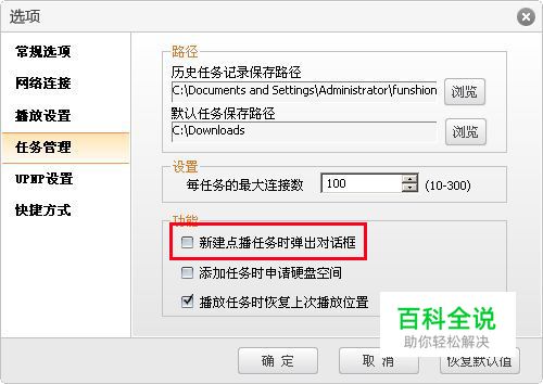 三、下载埋伏 当然,如果有人在繁忙的工作时间想让风行在后台默默的下载,然后等空闲时再导入自己的MP4播放器中观看。可点击风行上的“菜单”按钮,然后点击“设置--选项”,在弹出的窗口中,点击“任务管理”标签栏,取消“新建点播任务时弹出对话框”选项(图2),最后点击“确定”按钮后,这样在风行中点播任一节目,就不会有选择权了,直接显示播放窗口,让他欲盖弥彰。 图2