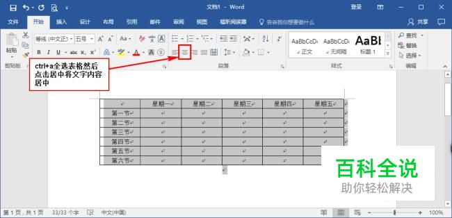 输入完内容以后就是对表格的整体设置,按crtl+a选择所有的表格内容,在开始工具栏中点击居中,将所有内容居中
