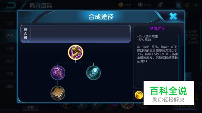梦魇之牙,为甄姬提供高额的法术攻击和移动速度加成。被动-重伤,使攻击目标的生命恢复效果减少50%,持续一段时间