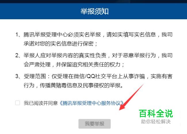 进入网站后会收到一份责任协议,勾选下方的协议后点击下方的我要举报。