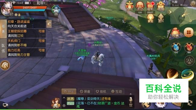 人物开启后,我们就会骑上一只坐骑,点击任务栏中的任务即可自动寻路,这时候我们看到右下角有两个大按钮,左侧的是跳跃,右侧的是加速。