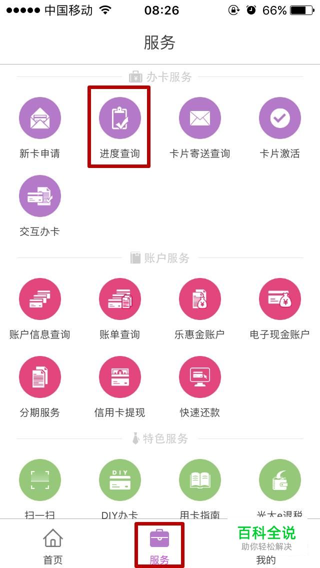微信关注光大银行信用卡中心,关注之后,点击用卡服务,然后点击“进度查询”;