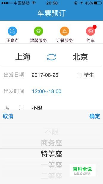 接着设置好所坐的座位类型(商务座、特等座、一等座、二等座等)。