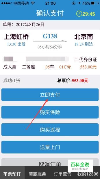 最后在“确认支付”页面点击立即支付按键,之后完成付款这样火车票就购买成功了。