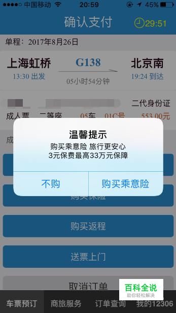 此时会弹出“温馨提示”对话框,如果乘客想要购买乘意险则点击对话框中的“购买乘意险”按键,如果不想购买则点击“不购”按键。