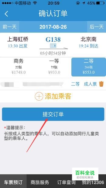 这时会弹出“确认订单”按键,在此页面乘客可以再次确认所买火车票的相关信息,然后点击“提交订单”按键。