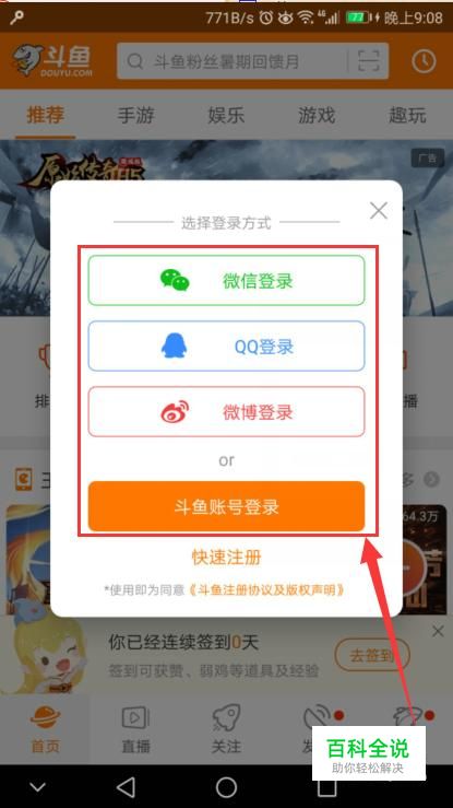 首先,解锁手机,接着我们点击斗鱼直播,打开直播间,我们点击登录,小编的是手机账号登录,这有多种的登录方式选择,如图所示。