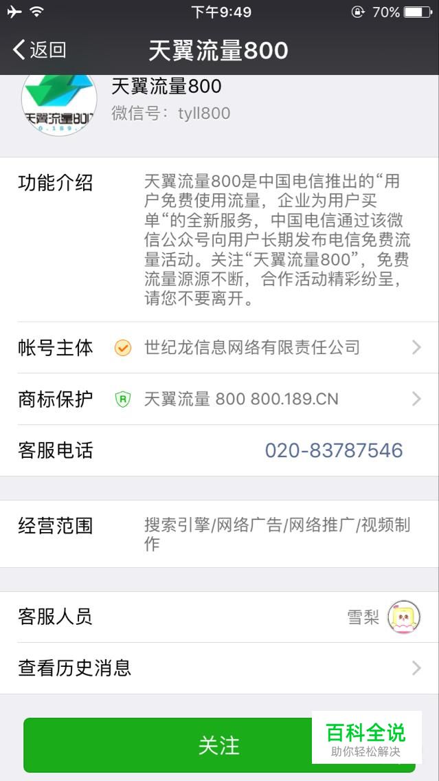微信中添加公众号“天翼流量800”,并关注公众号。