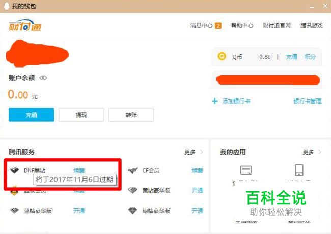 打开QQ钱包,可查看自己的账户余额和腾讯服务。把光标放到自己开通的服务上,即可显示出到期时间。 如图所示图示,小编的黑钻贵族将于2017年11月6日过期。