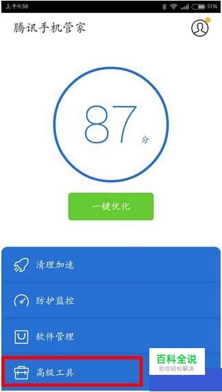 首先在应用市场中选择一款手机管家的应用,好多手机会自带这一软件的,今天我们以腾讯手机管家为例。首先打开手机管家进去主页面,下方找到一个“高级工具”,点击进入
