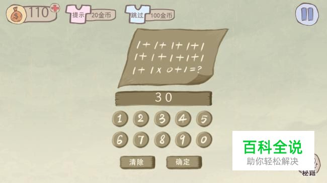史上最坑爹的游戏第1关:计算图中数字得数,真正的算式是【1+1+1+1+11+1+1+1+11+1*0+1=?】,所以答案是【30】。