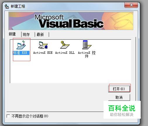 打开VB6.0新建一个标准EXE,点击“打开”。小编将带领大家通过两个程序来了解这两个函数。