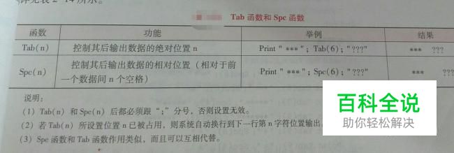 Tab和Spc函数可以使信息按照一定的格式输出,具体输出方法如图中的表格。