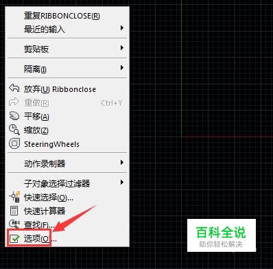 打开该软件后,可以看到绘图菜单就不见了,在绘图区里点击鼠标右键,在弹出的菜单里找到选项选项,如图所示:
